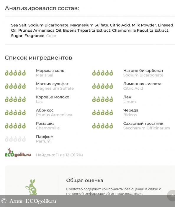 СОСТАВ (INCI): Sea Salt (соль морская), Sodium Bicarbonate (сода), Magnesium Sulfate (соль сульфат магния), Citric Acid (лимонная кислота), Milk Powder (молоко), Linseed Oil (масло семян льна), Prunus Armeniaca (Apricot) Oil (масло абрикоса), Bidens Tripartita (череды) Extract, Chamomilla Recutita (ромашки) Extract, Sugar, Fragrance, Color.