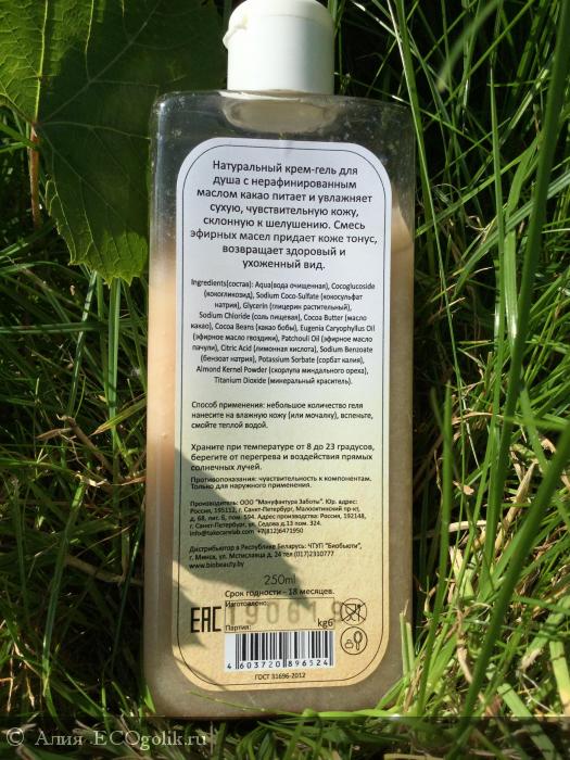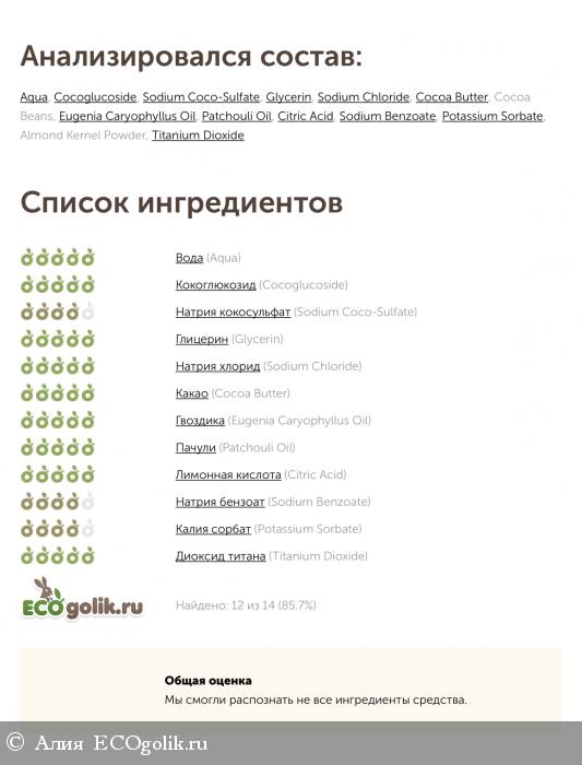 Ingredients: Aqua(вода очищенная), Cocoglucoside (кокогликозид), Sodium Coco-Sulfate (кокосульфат натрия), Glycerin (глицерин растительный), Sodium Chloride (соль пищевая), Cocoa Butter (масло какао), Cocoa Beans (какао бобы), Eugenia Caryophyllus Oil (эфирное масло гвоздики), Patchouli Oil (эфирное масло пачули), Citric Acid (лимонная кислота), Sodium Benzoate (бензоат натрия), Potassium Sorbate (сорбат калия), Almond Kernel Powder (скорлупа миндального ореха), Titanium Dioxide (минеральный краситель).