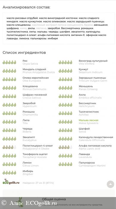 масло рисовых отрубей, масло виноградной косточки, масло сладкого миндаля, масло кунжутное, масло оливковое, масло зародышей пшеницы, масло клещевины, масляный экстракт лотоса священного, брами, женьшеня, шафрана, нима, амлы, люпина, зверобоя, бессмертника, ромашки, тысячелистника, липы, мальвы, череды, шалфея, эвкалипта, календулы, полиглицерил-4 олеат, альфа-липоевая кислота, витамин Е, эфирное масло лаванды, лимона, пальмарозы, имбиря.
