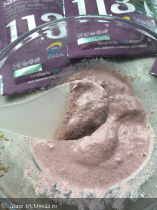 Содержимое пакетика смешиваю с 30 мл гидролатом до однородной консистенции. Разводится она легко, комочки не образуются. Консистенция получается чуть гуще, чем тесто на оладушки.