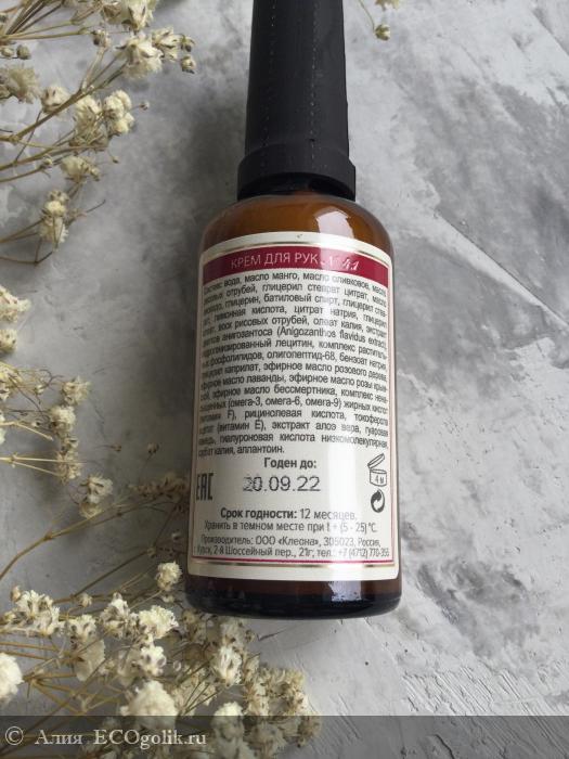Состав: вода деионизированная, масло манго, масло оливковое, масло рисовых отрубей, глицерилстеарат цитрат, масло авокадо, глицерин растительного происхождения, батиловый спирт, глицерилстеарат, лимонная кислота, цитрат натрия, глицерилолеат, воск рисовых отрубей, олеат калия, экстракт цветков анигозантоса (Anigozanthosflavidusextract), гидрогенизированный лецитин, комплекс растительных фосфолипидов, олигопептид-68, бензоат натрия, глицерилкаприлат, эфирное масло розового дерева, эфирное масло лаванды, эфирное масло розы крымской, эфирное масло бессмертника, комплекс ненасыщенных (омега-3, омега-6, омега-9) жирных кислот (витамин F), рицинолевая кислота, токоферола ацетат (витамин Е), экстракт алоэ вера, гуаровая камедь, гиалуроновая кислота низкомолекулярная, сорбат калия, аллантоин.