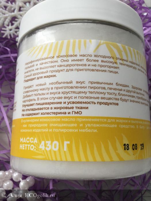 100% органическое нерафинированное кокосовое масло первого холодного отжима из мякоти кокоса.