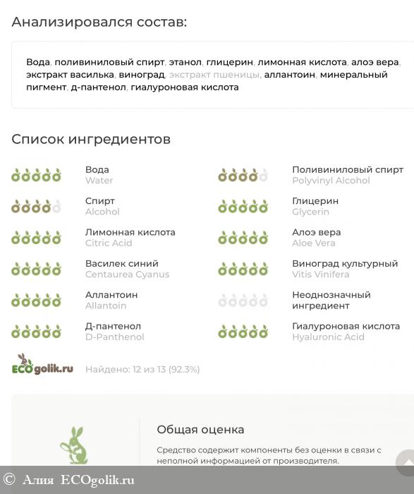 Вода, поливиниловый спирт, этанол, глицерин, лимонная кислота, алоэ вера, василек, виноград, пшеница, аллантоин, минеральный пигмент, д-пантенол, гиалуроновая кислота.