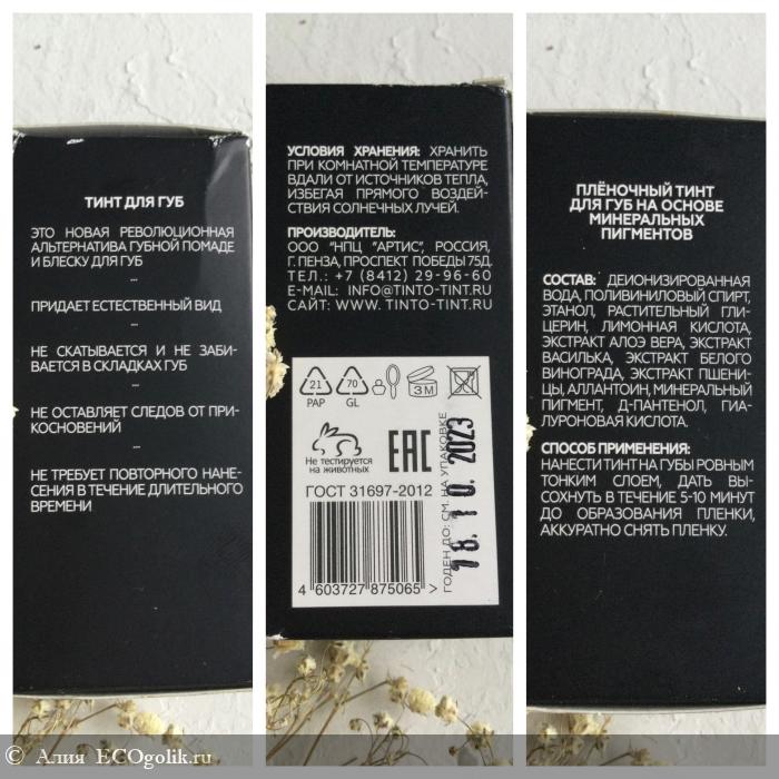 Тинт, как мне известно - это стойкий пигмент для губ, очень похожий на разбавленные чернила, который плотно «усаживается» на губах и обладает высокой стойкостью. Но в отличие от знаменитых корейских, средства Tinto обладают безопасным составом, что является новшеством в натуральной декоративной косметике