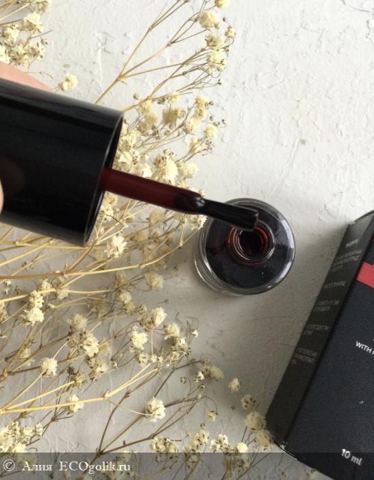 Производитель предлагает 7 видов оттенка, я выбрала рубиновый. На флаконе тинт кажется совсем чёрным, я даже несколько раз проверила переписку с представителем бренда, действительно ли прислали выбранный мною оттенок