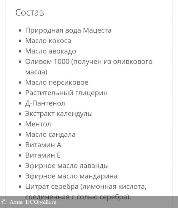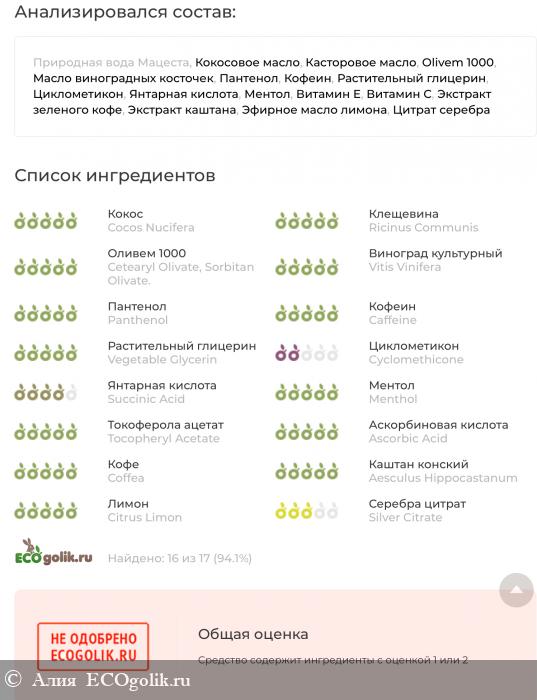 Природная вода Мацеста, Кокосовое масло, Касторовое масло, Olivem 1000 (получен из оливкового масла), Масло из виноградных косточек, Пантенол, Кофеин, Растительный глицерин, Циклометикон, Янтарная кислота, Ментол, Витамин E, Витамин C, Экстракт зеленого кофе, Экстракт каштана, Эфирное масло лимона, Цитрат серебра (лимонная кислота соединенная с солью серебра).