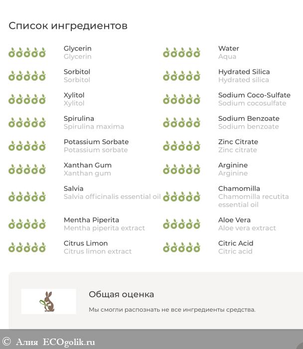 В составе несколько ингредиентов остались без оценки, среди них и фторид натрия, который завершает довольно длинный список.