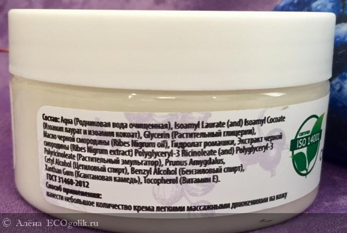Состав: вода родниковая, изоамил лаурат, изоамил кокоат, растительный глицерин, масло чёрной смородины, гидролат ромашки, экстракт чёрной смородины, растительный эмульгатор, цетиловый спирт, бензиновый спирт, ксантановая камедь, витамин Е.