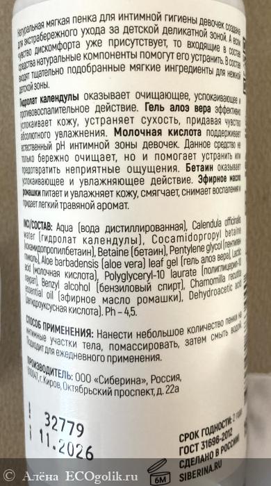 Как я уже написала в начале отзыва, пенку я взяла для дочки. Раньше пользовались средствами для подмывания малышей. Сейчас ей уже 4 годика, вот я и решила приобрести специальное средство. Пенка от Siberina рекомендована девочкам от 3х лет.