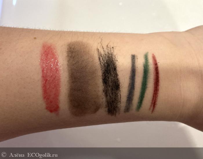 , помада, тени водостойкая тушь и стойкий карандаш для глаз.