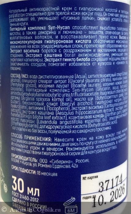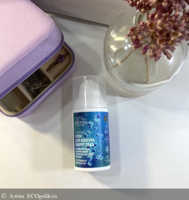 Антивозрастной гиалуроновый крем для контура вокруг глаз с пептидным комплексом против возрастных морщин SIBERINA