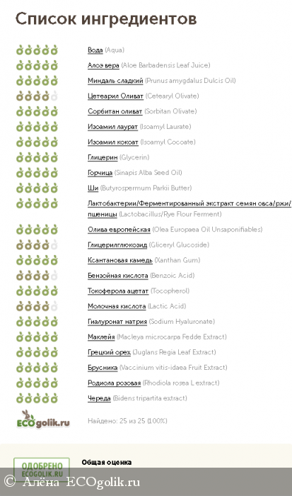 Состав: Aqua (Родниковая вода), Aloe Barbadensis Leaf Juice (Сок алоэ вера), Prunus amygdalus Dulcis Oil (Масло миндальное), Cetearyl Olivate (and) Sorbitan Olivate (растительный эмульгатор), Isoamyl Laurate (and) Isoamyl Cocoate (растительный эмолент), Glycerin (глицерин), Sinapis Alba Seed Oil (Масло горчицы), Butyrospermum Parkii Butter (Масло ши), Lactobacillus/Rye Flour Ferment (Ферментированная рожь), Hydrogenated Olive Oil, Olea Europaea (Olive) Fruit Oil, Olea Europaea (Olive) Oil Unsaponifiables (Растительный со-эмульгатор), Gliceryl Glucoside (Глицерил глюкозид), Xanthan Gum (Ксантановая камедь), Benzoic Acid (Бензойная кислота), Tocopherol (Витамин Е), Lactic Acid (Молочная кислота), Sodium Hyaluronate (Гиалуронат), Macleya microcarpa (Maxim.) Fedde. Extract (Экстракт маклейи), Juglans Regia Leaf Extract (Экстракт грецкого ореха), Vaccinium vitis-idaea Fruit Extract (Экстракт брусники), Rhodiola rosea L. extract (Экстракт родиолы розовой), Bidens tripartita extract (Экстракт череды).