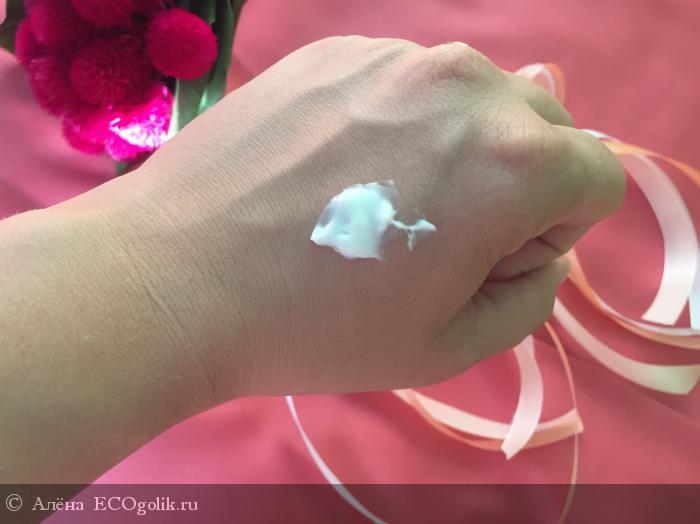 Вернёмся к самому крему. Консистенция у него очень легкая. Она не жидкая, форму хорошо держит. Цвет белый, при нанесении не полосит.