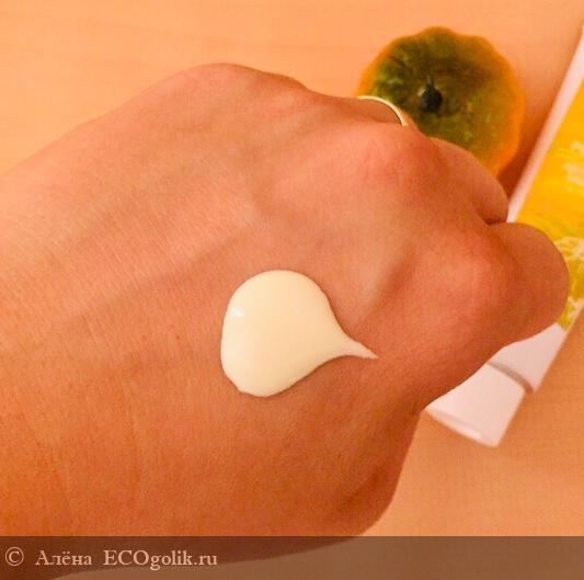 Я помню, что примерно пару лет назад крема для рук у бренда находились в стеклянных флаконах с помповым дозатором. Не знаю, почему поменяли упаковку, но данная вполне неплохая. Во время использования продукта на ней не появляются заломы и крем не вытекает. Но, когда средства остаётся на пару применений, то извлекать его трудновато.