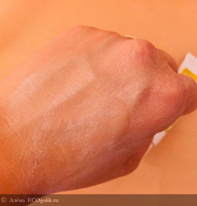 Распределяется по коже очень тяжело. Она как-будто «меловая» и ее невозможно нормально размазать по руке.