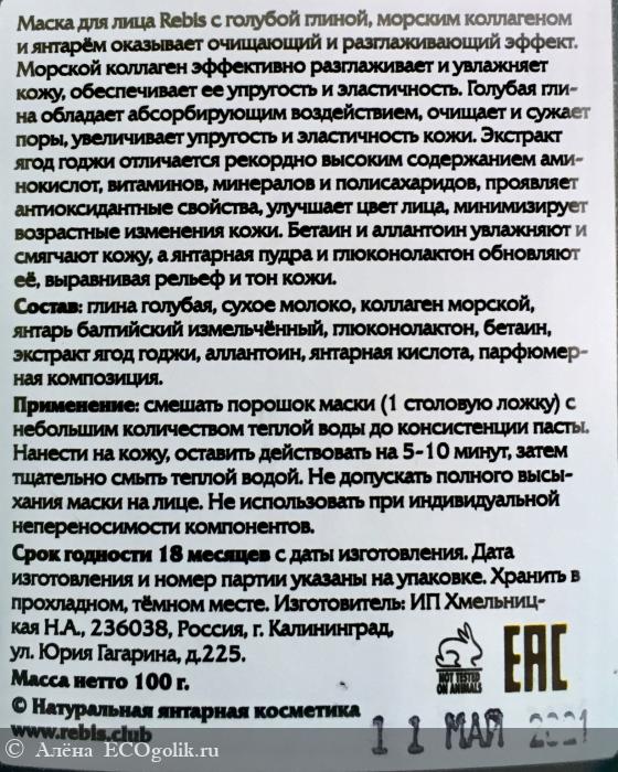 Этот отзыв хочу посвятить Маске для лица с голубой глиной, коллагеном и янтарем Rebis.