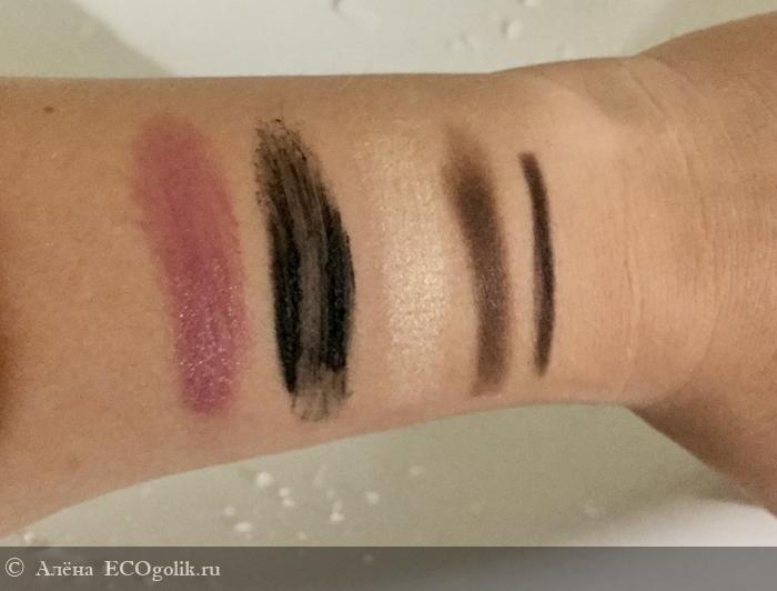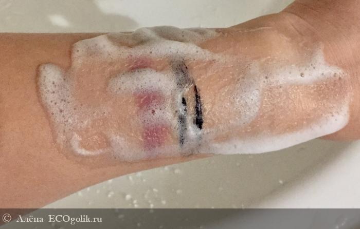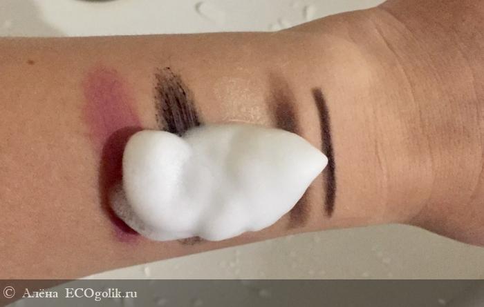 Хоть производитель не обещает, что средство смывает макияж, но я всегда проверяю это. На свотчах: карандаш для глаз, тени для бровей, тени для век, тушь для ресниц, губная помада.