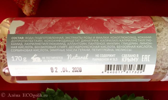 Состав: вода подготовленная, экстракты розы и фиалки, кокоглюкозид, кокамидопропилбетаин, кокоамфодиацетат динатрия, каприлил/каприлметилглюкамид, лаурилметилглюкамид, аллантоин, пантенол, инулин, глицерин, лимонная кислота, бензиловый спирт, дегидроуксусная кислота, бензойная кислота, сорбиновая кислота, эфирные масла герани, петитгрейна, мелиссы.