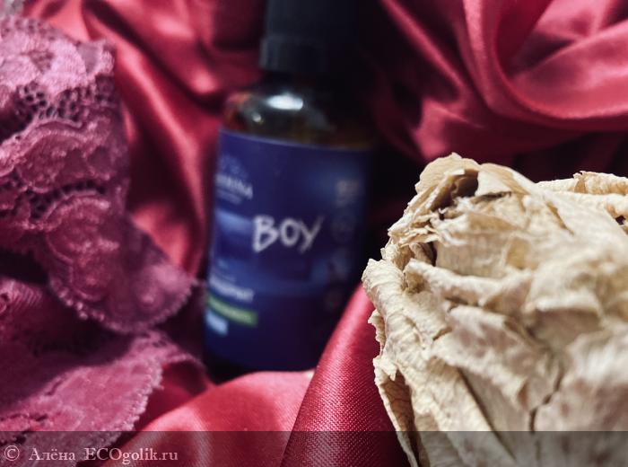 Итак, как мы видим, средство находится в темном стеклянном флаконе с распылителем. На этикетке красуется надпись «Boy», то есть мужской