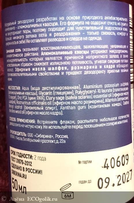 Состав: Aqua (вода дистиллированная), Aluminium potassium sulphate (алюмокалиевые квасцы), Glycerin (глицерин), Polyglyceryl-10 laurate* (полиглицерил-10 лаурат), Zinc PCA (цинк ПКК), Clary sage (salvia sclarea) essential oil (эфирное масло шалфея), Rosmarinus officinalis oil (эфирное масло розмарина), Allantoin (аллантоин), Benzyl alcohol (бензиловый спирт), Xanthan gum (ксантановая камедь), Cedrus deodara wood oil (эфирное масло кедра).