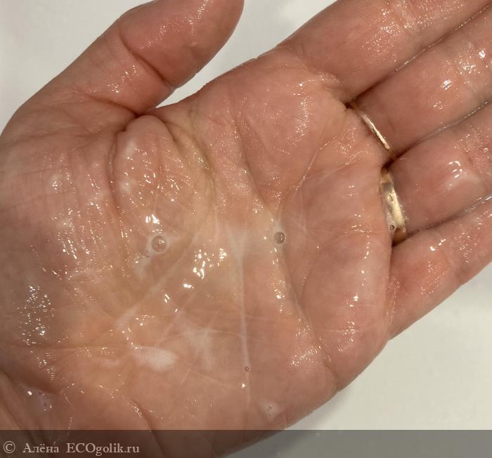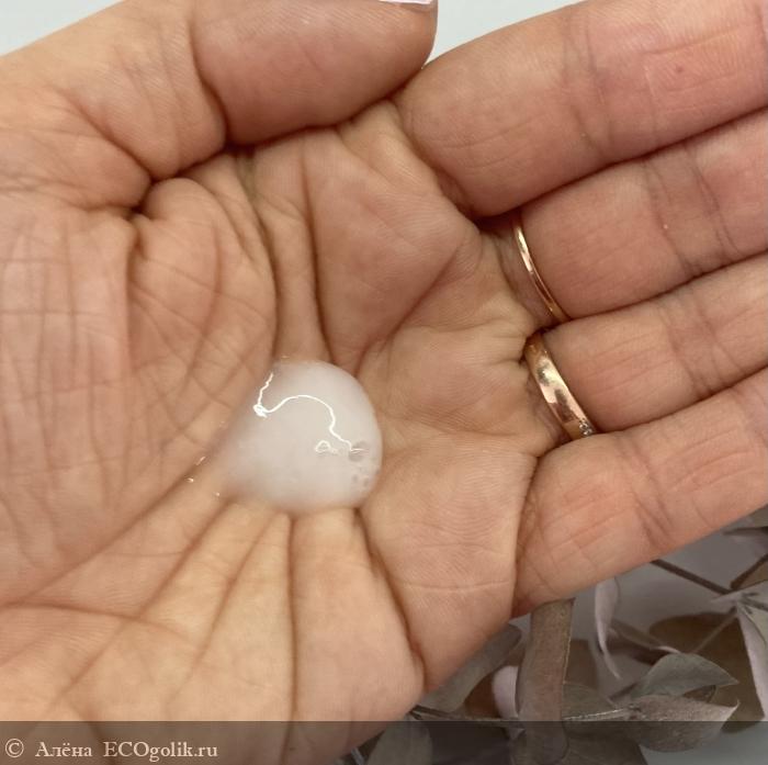 Посмотрим консистенцию она не густая, слегка жидковатая. Мутно-белого цвета. Я бы даже сказала, что текстура средняя между стандартный гелем и молочком для умывания.