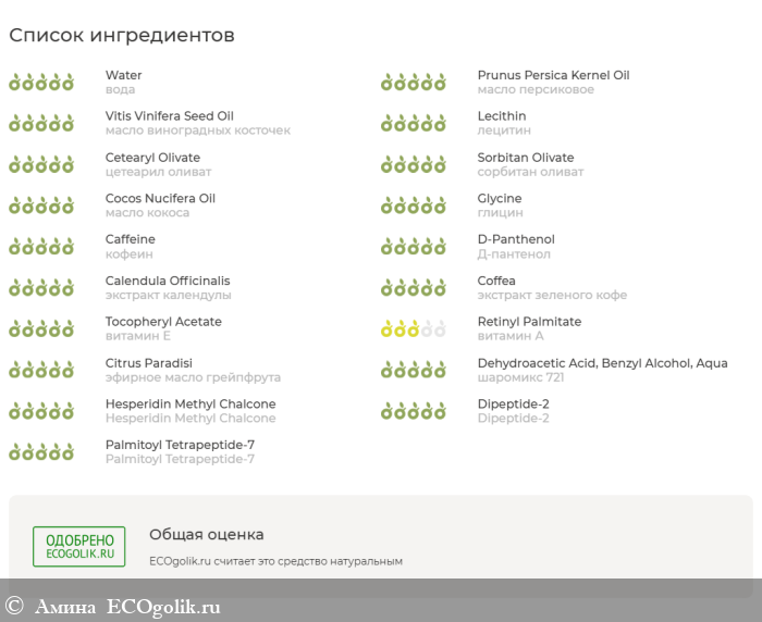 У средства большой объем, поэтому это покупка на долгие месяцы. И каждый день есть возможно репарировать кожу под глазами, потому что у пептидов именно такая функция – они «чинят» кожу. В составе этого крема сразу несколько пептидов - это дипептид и липопептид. Производитель объединил их в Eyeliss комплекс. Я проверяла их по отдельности, потому что иначе Экоголик их не находит. Хочу дополнительно указать, что все ингредиенты данного средства получили ECO и BIO сертификаты.