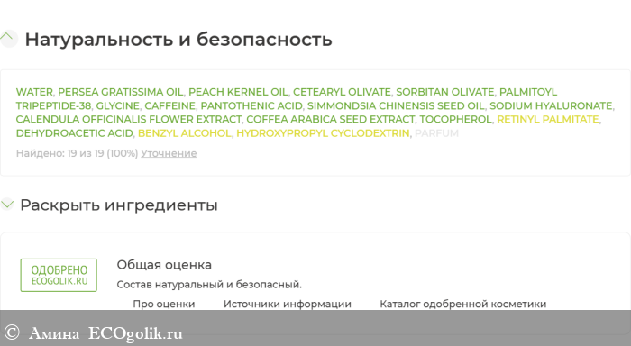 Все составляющие крема натуральные и одобрены. Это исключительно безопасные компоненты для ухода за областью вокруг глаз. Этот крем содержит комплекс пептидов, что позволяет отнести его и к числу антивозрастных средств. За счет пептидного комплекса из водорослей, гиалуроновой кислоты, экстракта зеленого кофе и масла персиковых косточек. Благодаря последнему компоненту кожа прекрасно успокаивается. Это отличный крем. Я его однозначно рекомендую.