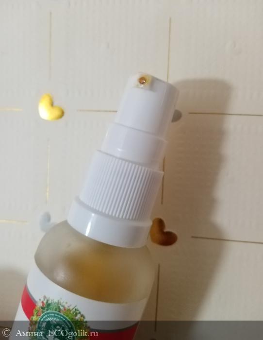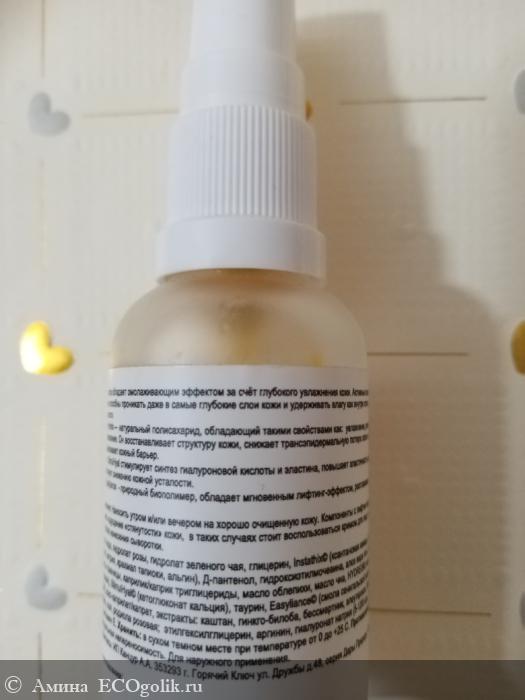 Сыворотка находится в флакончике с дозатором, имеет объем 30 мл. Она ярко-желтого цвета, потому что в ней есть облепиха. Состав у сыворотки просто замечательный. Помимо ожидаемой гиалуроновой кислоты это сквалан, протеины пшеницы, натуральные масла, конский каштан. Продукт имеет полностью натуральный состав, что подтверждается анализом на Экоголике. То есть в этом бьюти продукте отсутствуют парабены, силиконы, красителе и отдушки. Это очень здорово, потому что отсутствие оных означает отсутствие негативных реакций на коже. И действительно, даже для моей чувствительной кожи сыворотка максимально комфортна.