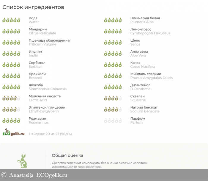 деионизированная вода c экстрактом франжипани, экстрактом марианской сливы, экстрактом мандарина, экстрактом лемонграсса, гидролизованные протеины пшеницы, протеины шелка, протеины риса, инулин, гель алоэ-вера, сорбитол, масло кокоса, масло брокколи, масло миндаля, масло жожоба, провитамин В5, молочная кислота, сквалан растительный, этилгексил глицерин, бензоат натрия, экстракт розмарина, ароматическое масло.