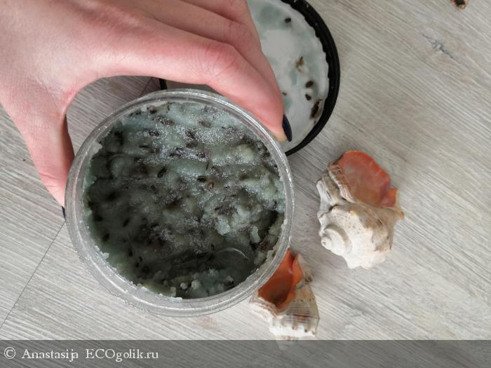 На самом деле скраб меня очень порадовал, поскольку в нем, помимо морской соли, присутствуют цветки лаванды, которые тоже играют отшелушивающую роль.