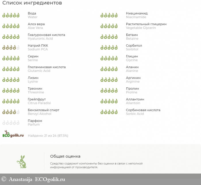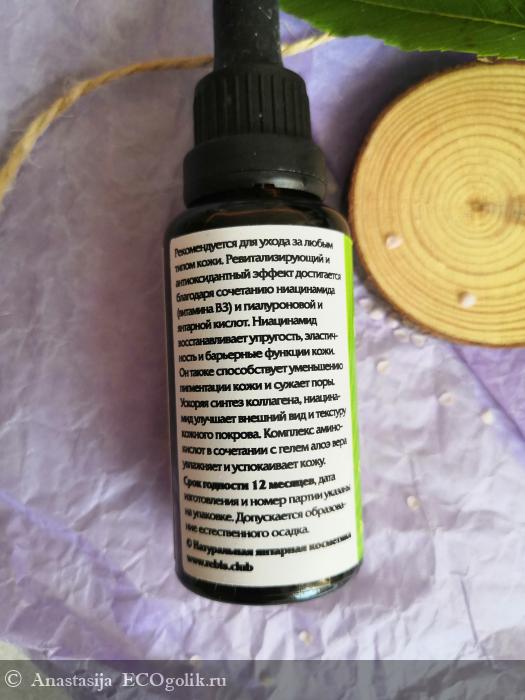 Ревитализирующий и антиоксидантный эффект достигается благодаря сочетанию ниацинамида (витамина B3) и гиалуроновой и янтарной кислот. Ниацинамид восстанавливает упругость, эластичность и барьерные функции кожи, обеспечивая её повышенную устойчивость к трансэпидермальной потере воды. Он также способствует уменьшению пигментации кожи и сужает поры. Ускоряя синтез коллагена, ниацинамид улучшает внешний вид и текстуру кожного покрова. Комплекс аминокислот в сочетании с гелем алоэ вера увлажняет и успокаивает кожу, а аллантоин смягчает и обновляет её.
