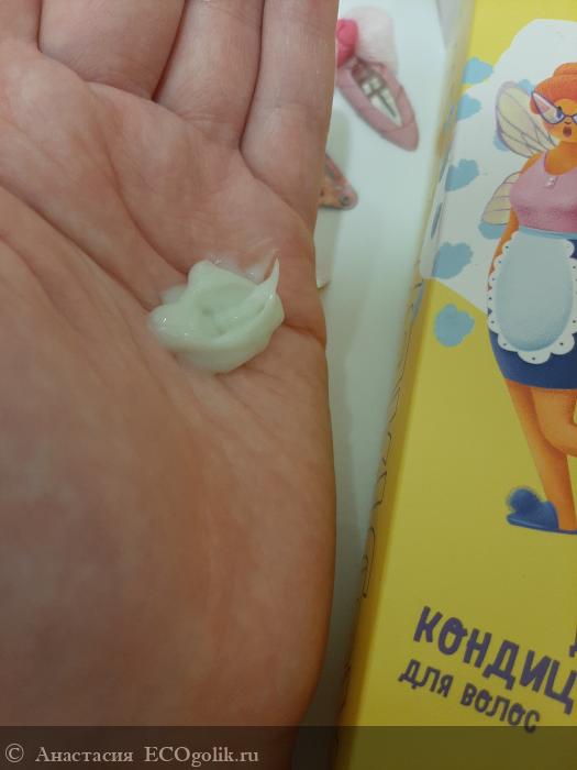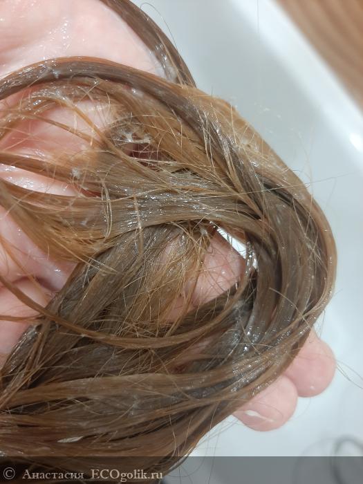 На фото волосы с нанесённым кондиционером. Каролина не захотела делать фото в ванной, поэтому для того чтобы показать наглядно продукт на волосах я сфотографировала свои волосы. К слову, этот кондиционер я тоже использую и тоже довольна им )