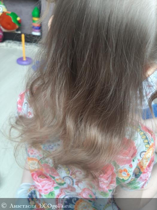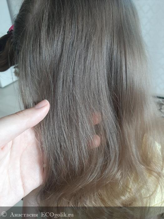 По волосам распределяется легко. У моей дочки не очень густой волос, поэтому нам достаточно небольшого количества продукта. Буквально тройка полных нажатий на дозатор. Ниже на фото порция для одной процедуры и длина волос Каролины