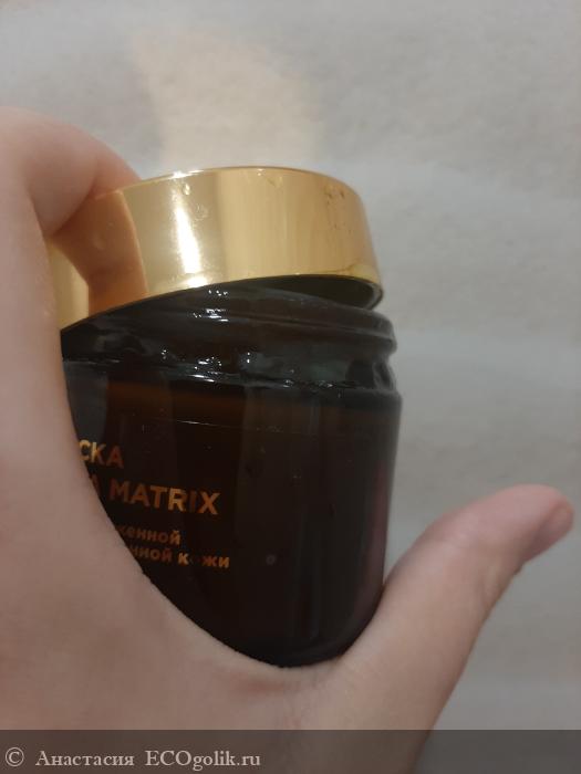 Итак, в комплекте с красивой баночкой вы получаете шпатель, которым удобно извлекать маску. Продукт защищён только золотой крышкой - шайбой. Дополнительной защиты нет и часть продукта немного протекло на горлышко банки