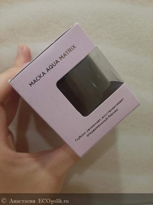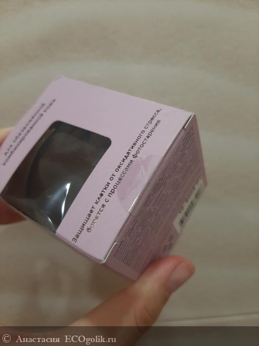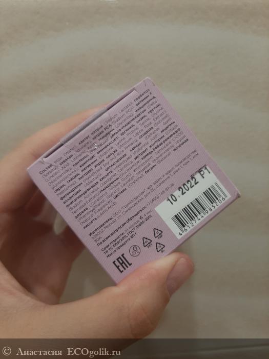 Стильная баночка матового стекла приходит в картонной коробке с "окошком" из прозрачного материала. Смотрится это очень интересно. Сверху и снизу коробки есть круглая клейкая лента, которая гарантирует первое вскрытие. Вокруг расположена вся важная информация о продукте и производителе