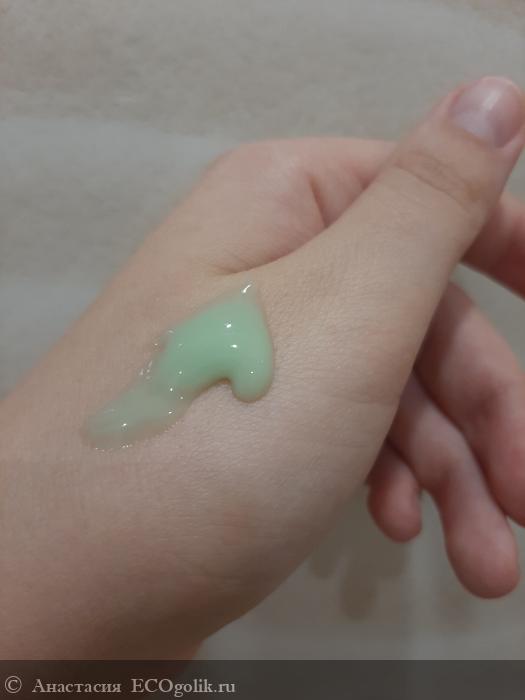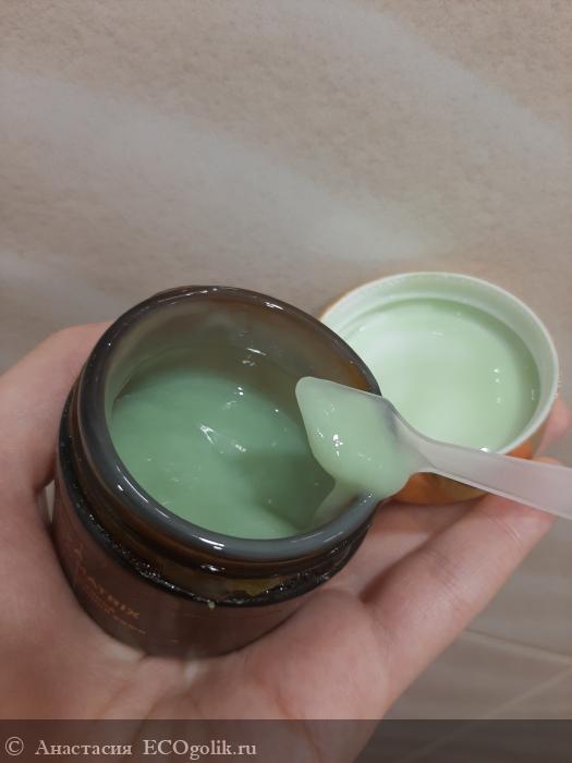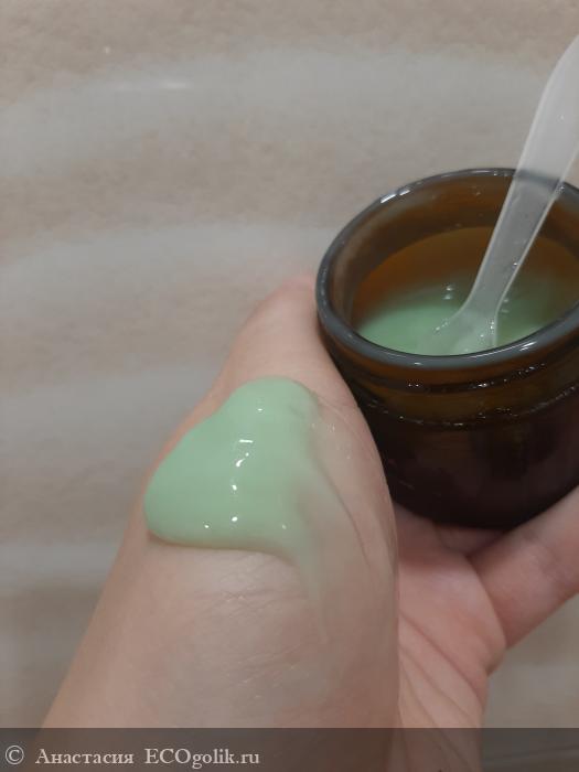 Маска имеет гелевую текстуру, по коже скользит. Цвет фисташковый в банке, но при наннсении на лицо слой получается недостаточно плотным чтобы передать цвет. Поэтому на лице маска выглядит прозрачной