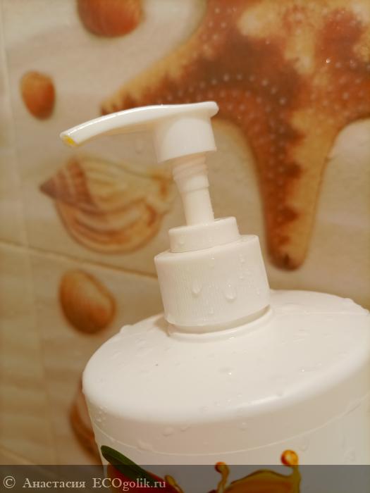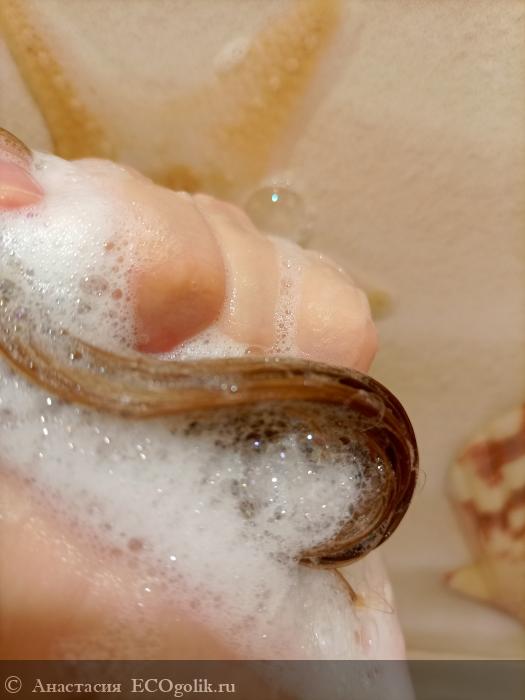 По консистенции шампунь кондиционер жидкий. Он взбивается в пышную, мягкую, ароматную пену. У меня волосы достаточно длинные, почти до поясницы. Но я не наношу продукт по всей длине, а только на макушку. Длину промываю образовавшейся пеной. На одну такую процедуру мне нужно два-три нажатия на флакон. Он кстати очень удобный. Дозатор работает мягко и не нужно прилагать больших усилий чтобы извлечь порцию. Что примечательно, горлышко дозатора не засоряется подсохшим средством. Я использую шампунь кондиционер с июля и такого не было не разу.