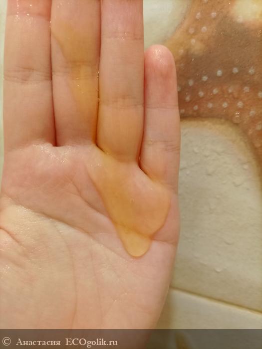 Первое положительное впечатление от использования подарил аромат. Это яркий и сочный запах манго. В этом аромате сплелись воедино все три месяца жаркого лета. Цвет у шампуня соответствующий. Он оранжевый и полупрозрачный. Будто солнечный