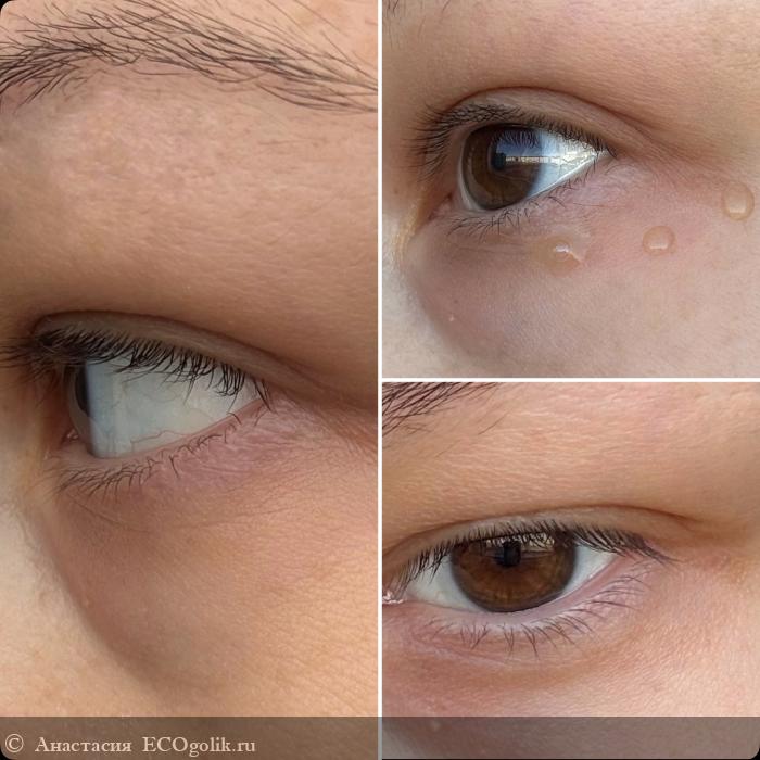 Кожа вокруг глаз становится увлажненной и мягкой. Мелкие морщинки наполняются и разглаживаются. В течение дня нет какого-то утяжеления век, только комфортные ощущения.