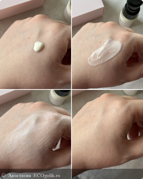 Крем имеет флюидную текстуру, но по мере распределения она становится более плотной. Но при этом быстро и легко впитывается, не оставляет липкости, жирности или еще-какого-либо дискомфорта: