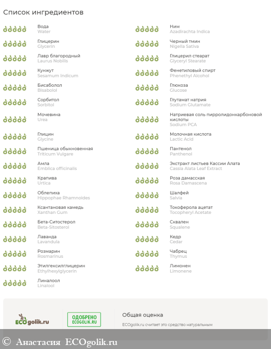 Aqua, Melia Azadirachta Seed Oil, Glycerin, Nigella Sativa Seed Oil, Laurus Nobilis Fruit Oil, Glyceryl Stearate, Sesamum Indicum Seed Oil, Phenethyl Alcohol, Bisabolol, Glucose, Sorbitol, Sodium Glutamate, Urea, Sodium PCA, Glycine, Lactic Acid, Hydrolyzed Wheat Protein, Panthenol, Emblica Officinalis Fruit Extract, Cassia Alata Leaf Extract, Urtica Dioica Leaf Extract, Rosa Damascena Flower Extract, Rosmarinus Officinalis Extract, Hippophae Rhamnoides Fruit Extract, Salvia Officinalis Leaf Extract, Xanthan Gum, Tocopherol, Beta-Sitosterol, Squalene, Lavandula Angustifolia Oil, Cedrus Atlantica Wood Oil, Rosmarinus Officinalis Leaf Oil, Thymus Serpyllum Extract, Ethylhexylglycerin, Limonene, Linalool.