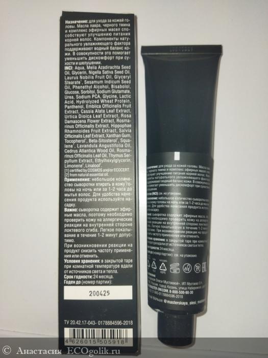 Я заказала сыворотку в объёме 70 мл для пробы и, как только она пришла, тут же поспешила её нанести. Сама сыворотка по консистенции напоминает крем для лица Вечер от компании Свобода. Запах не резкий, хвойный, с нотками лаванды и тмина (лично я их ощущаю ярче остальных составляющих), расход экономичный, при нанесении ощущается лёгкий согревающий эффект, который пропадает через несколько минут, дискомфорта она не вызвала, равно как и раздражений или других проблем. Держала её около часа и пошла смывать (пробовала наносить на ночь, эффект почти такой же). Конечно не стоит ожидать ВАУ-эффекта с первого же применения, любому продукту нужно время, НО! Я всё-таки заметила один очень важный для меня плюс - количество выпавших волос уменьшилось вдвое (хотя на тот момент выпадение, как мне казалось, у меня в порядке норме)! Это поразительно! Ни один продукт ещё на моей памяти не давал эффекта с первого же применения! Особенно косметика с натуральными составами. Всегда нужно проходить курс, и то не всегда есть эффект. Но Мастерская Олеси Мустаевой вновь удивила меня! Все их продукты (а я перепробовала больше половины ассортимента) реально работают! Само собой я использовала весь тюбик и заказала себе ещё, но уже в большом формате, 120 мл. Фото ниже: