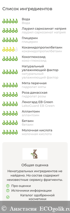 Состав: Вода, лаурил саркозинат натрия, глицерин, кокамидопропилбетаин, коко-глюкозид, натуральный увлажняющий фактор, гидролат мяты, гидролат розы, LekoGuard EB Green, гидрованс, аллантоин, бетаин, экстракт гинго-билоба, экстракт хурмы, молочная кислота.