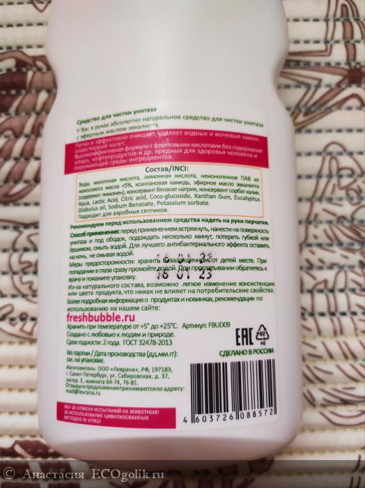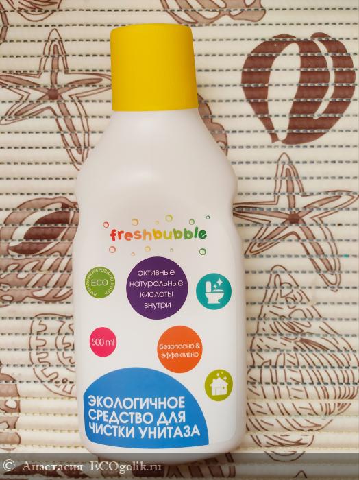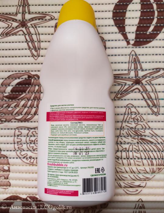 Надоело пользовать химией при уборке квартиры? Присмотритесь к средствам фирмы Freshbubble! Это реально находка! Раньше меня беспокоило, что вся химия, которой я так усердно навожу чистоту, попадает в окружающую среду. А запах? Его терпеть же не возможно, бьет в нос, дышать не чем. С этим гелем для унитаза я забыла обо всех своих страхах, его аромат наоборот оставляет только положительные впечатления. А к тому же, цена просто смешная, 230 руб.!
