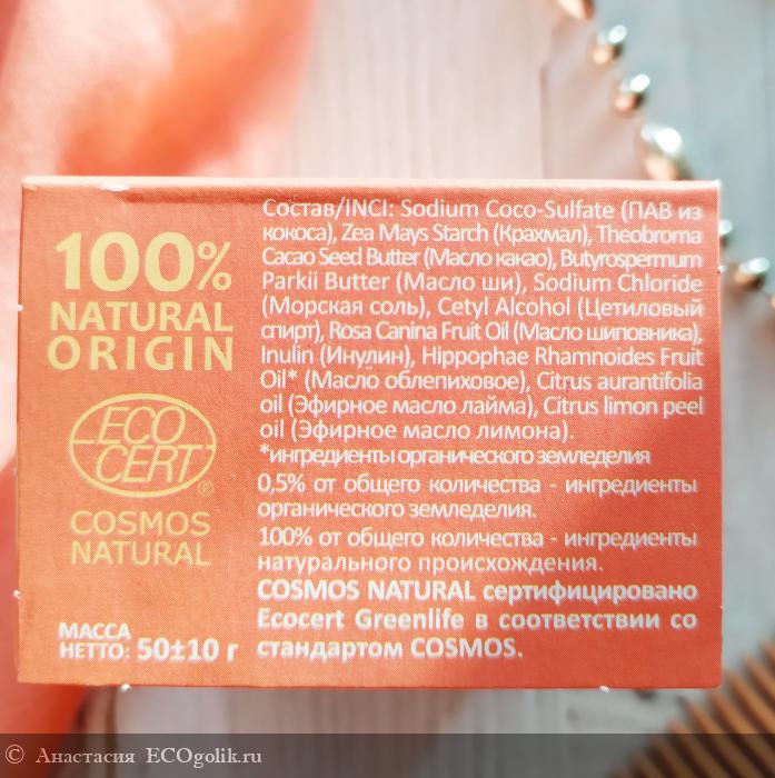 Sodium Coco-Sulfate (ПАВ из кокоса), Zea Mays Starch (Крахмал), Theobroma Cacao Seed Butter (Масло какао), Butyrospermum Parkii Butter (Масло ши), Sodium Chloride (Морская соль), Cetyl Alcohol (Цетиловый спирт), Rosa Canina Fruit Oil (Масло шиповника), Inulin (Инулин), Hippophae Rhamnoides Fruit Oil* (Масло облепиховое), Citrus aurantifolia oil (Эфирное масло лайма), Citrus limon peel oil (Эфирное масло лимона).