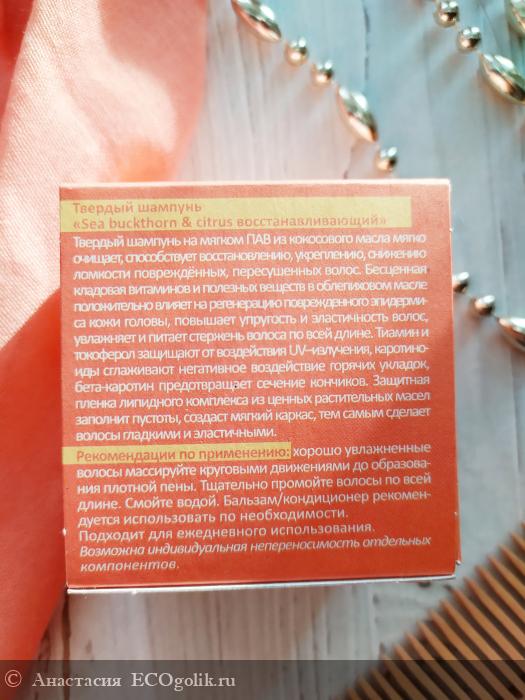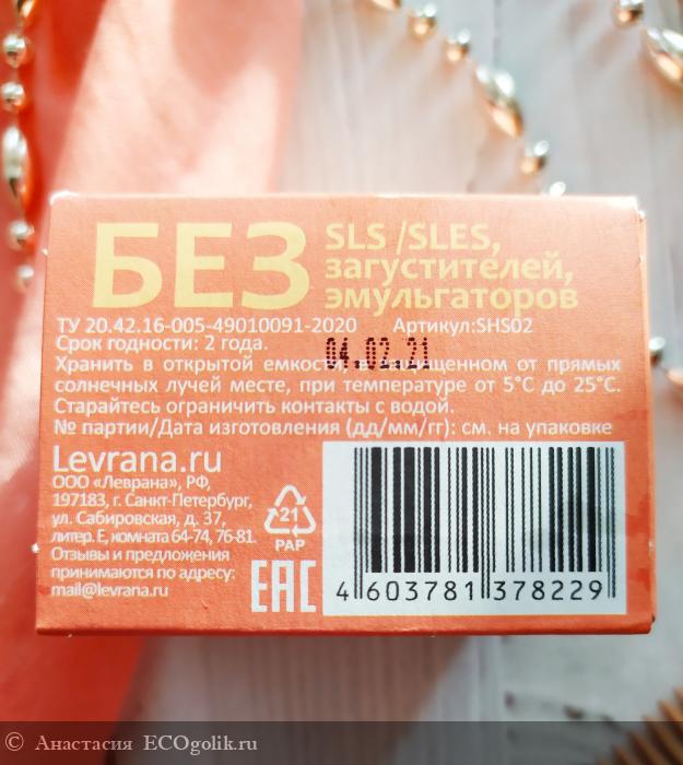 На одной из граней коробочки есть информация о производителе, сроке годности и стоит пометка о том, что шампунь не содержит запрещенных SLS, SLES ( ПАВы) лаурилсульфат натрия и лауретсульфат натрия, эмульгаторов. Это конечно же очевидные вещи, потому что в натуральной косметике второго компонента точно не может быть, он запрещен, но все равно даже людям, которые не особо вникают в чтение составов, но уже знают о вреде сульфатов, будет важно знать, что в данном шампуне их нет.