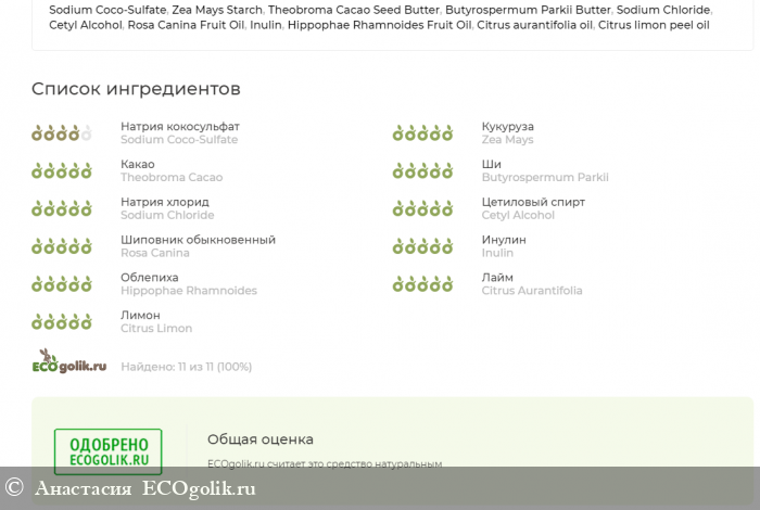 Решила провести проверку на Экоголике, но результат был очевиден. Все компоненты нашлись и оценены как безопасные и натуральные.