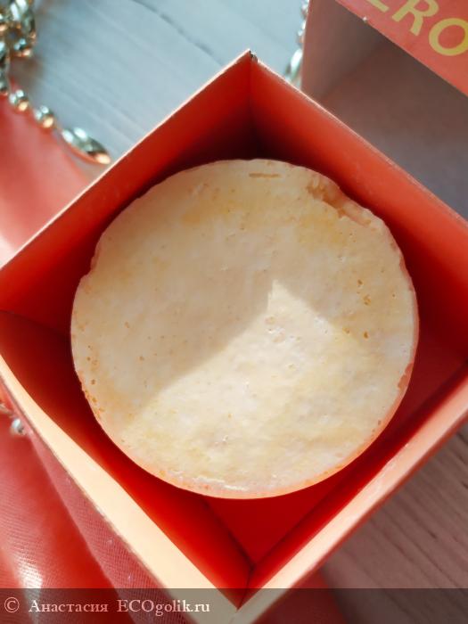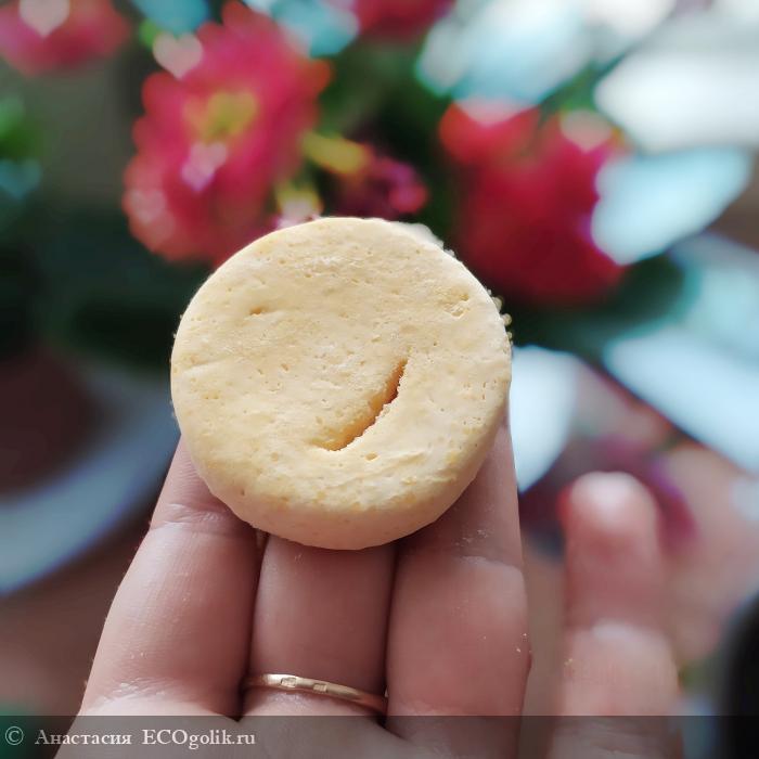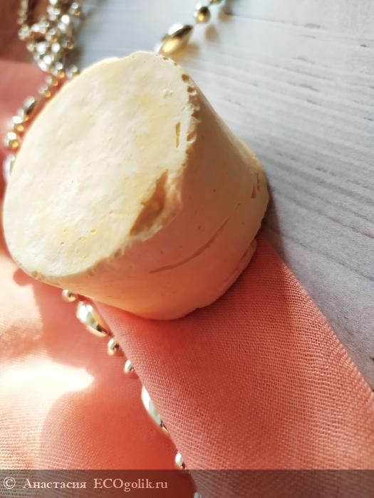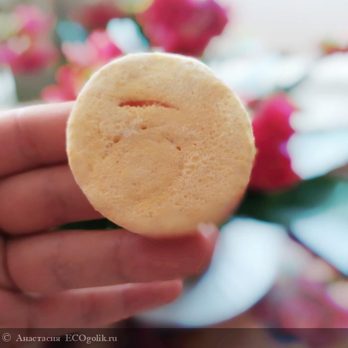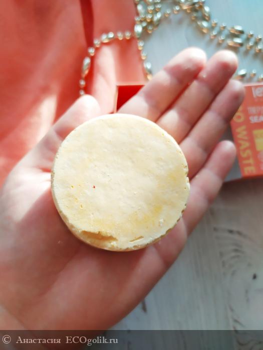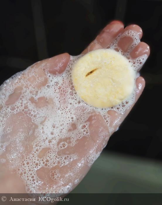 Есть маленький нюанс который заключается в том, что шампунь немного крошится. От него легко отделяются маленькие частички, а когда держишь в руках, то на них остаются крупинки, могу предположить, что это крохмал так себя ведет. Этим свойством шампунь обладал изначально. При использовании шампунь остается на мыльнице, на ее поверхности можно обнаружить все те же мокрые частички. Но при этом это не мешает мне наслаждаться его эффективностью и никак не сокращает срок его службы.