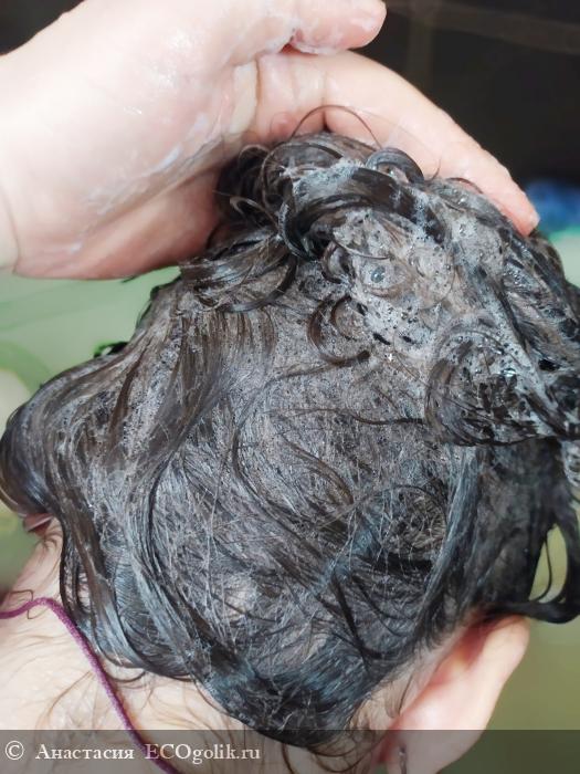 Некоторые натуральные мыла, жидкие и твердые шампуни очень слабо пенятся, что мне лично не очень нравится, потому что если это гель для душа, то я не чувствую себя достаточно чистой, если шампунь, то приходится наносить и смывать несколько раз, переживая, а промылись ли волосы. Тут же напротив, с первого раза пены довольно много, не шапка конечно, но стоит только провести по волосам и они уже хорошо намылены. Не приходится долго и мучительно тереть кусочком шампуня по волосам, на фото ниже видно. Сделала фото дочери во процесса мытья головы, потому что сама себя сфотографировать в этот момент не могу.