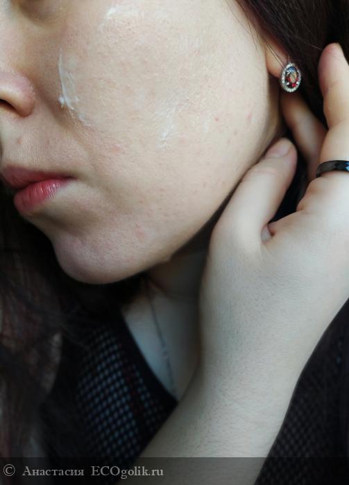 Наношу крем по массажным линиям и не замечаю как быстро это происходит. Крем быстро впитывается благодаря своей консистенции. Он не становится белым при распределении, а просто исчезает.
